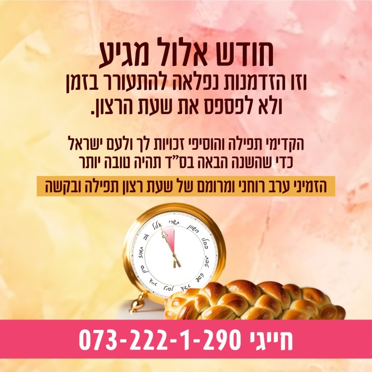 אל תדחי את זה יותר... קול דודי דופק, ועם ישראל צריך את הזכויות שלך! הזמיני עכשיו לביתך את הזכות,את הברכה,את הישועה של מצוות הפרשת חלה, כי יפה שעה אחת קודם. היכנסי לכאן, או חייגי לפרטים: 073-222-1-290.