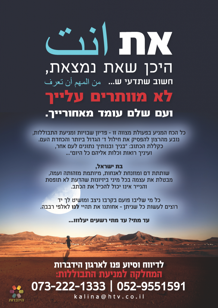 שבויות – המחלקה למניעת התבוללות, לפניות ודיווחים: טל' 073-2221333 או 052-9551591. מייל kalina@htv.co.il