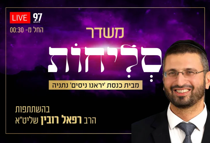 הלילה החל מהשעה 00:30: משדר סליחות מיוחד מבית הכנסת "יראנו ניסים" בנתניה, בהשתתפות הרב רפאל רובין שליט"א. שידור ישיר באתר ובערוץ הידברות