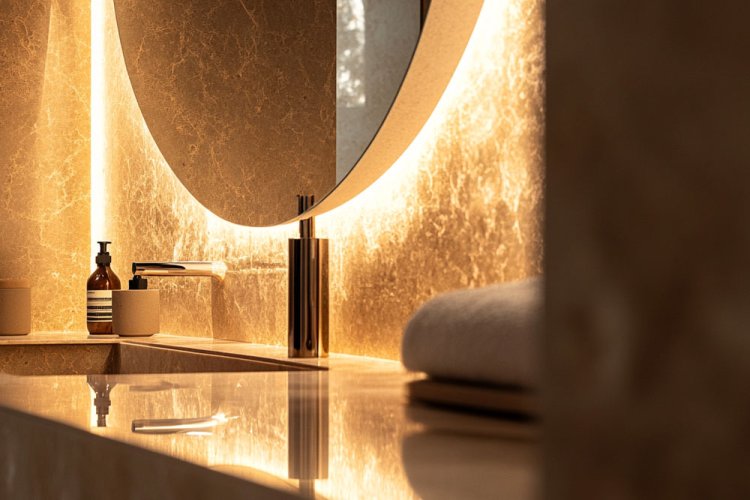 - לעומת זאת - בחדר האמבטיה נשתמש כמובן בתאורה חמה ונעימה, ונוסיף סביב המראה תאורה חמה נקודתית, דבר המייצר חוויית טיפוח מפנקת ויוקרתית.
