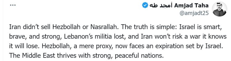 איראן לא מכרה את חיזבאללה או נסראללה. האמת פשוטה: ישראל חכמה, אמיצה וחזקה, המיליציה של לבנון הפסידה, ואיראן לא תסתכן במלחמה שהיא יודעת שהיא תפסיד. חיזבאללה, שהינו רק שליח, עומד כעת בפני היעלמות שנקבעה על ידי ישראל. המזרח התיכון משגשג עם אומות חזקות ושלוות.