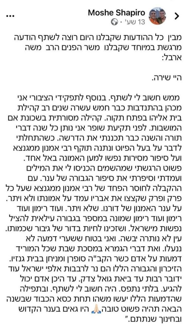 אביו של גיבור ישראל ענר שפירא הי"ד בפוסט מצמרר לזכרו, שלא יותיר עין יבשה: "שהדמעות הללו יעשו משהו תחת כיסא הכבוד"