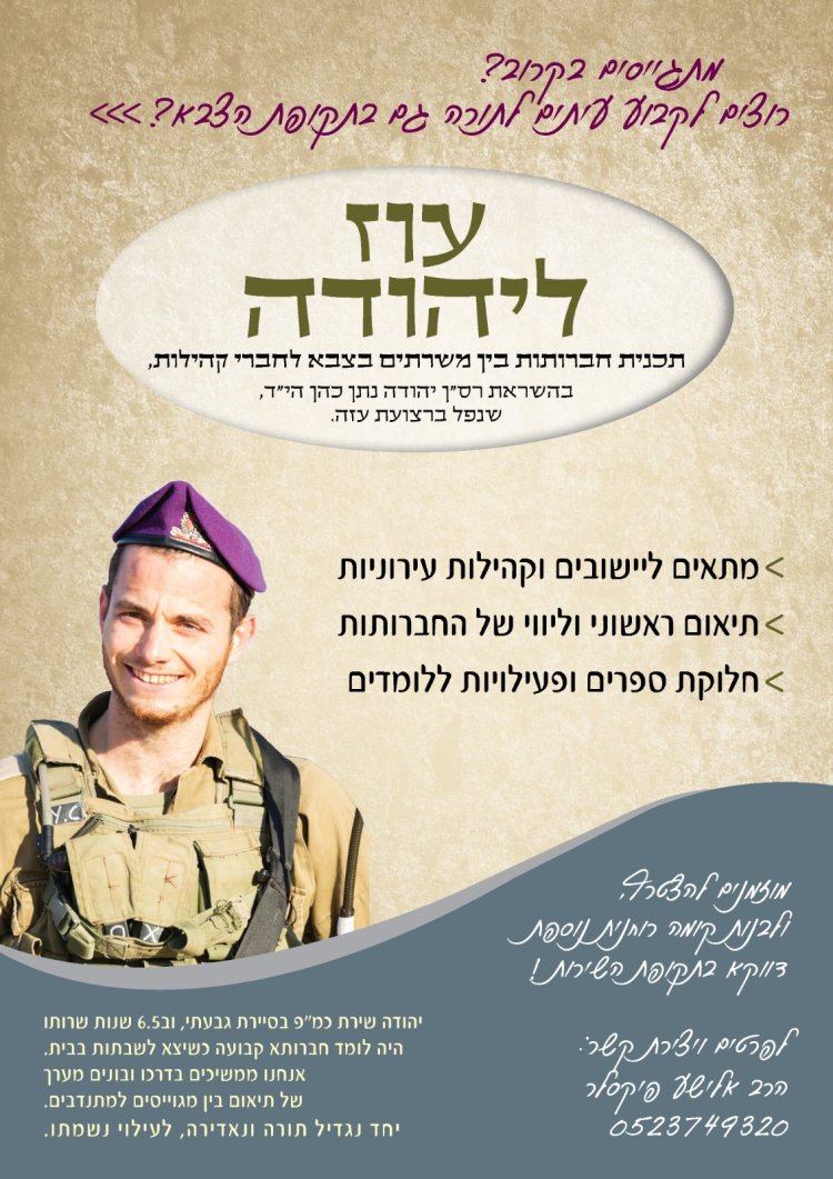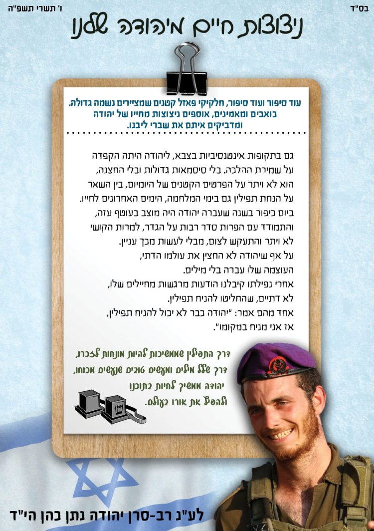 כדי להמשיך את האור ואת הדרך של יהודה שכל כך חסרים לנו – וכדי שכמה שיותר חיילים יוכלו לזכות בעוגן חשוב כזה בזמן שירותם - השקנו את תכנית 'עוז ליהודה': פרויקט קהילתי שמחבר בין חיילים וחיילות לבין חברי קהילות שילמדו יחד בחברותות לאורך השירות הצבאי, בהשראת ההתמדה של יהודה. ברוך השם אנו רואים ביקוש עצום והצלחה גדולה מאוד".