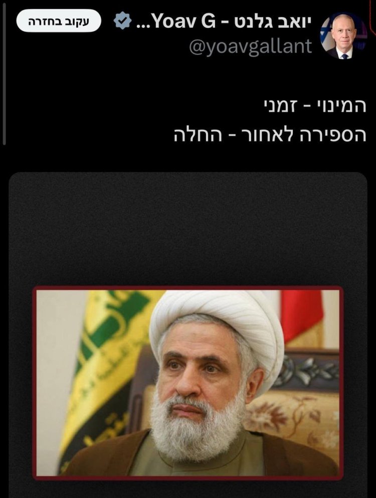 חיזבאללה הודיע על מינויו של נעים קאסם למזכ"ל ארגון הטרור. שר הביטחון יואב גלנט שיגר איום לא מרומז