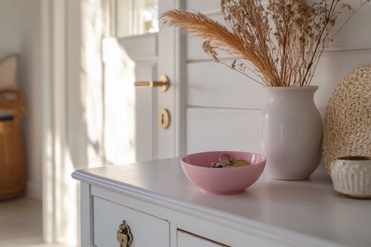 - קערת מפתחות או מתלה קיר: כדי למנוע מהשידה להפוך למקום מבולגן, נציב קערת מפתחות קטנה, או נשתמש במתלה קיר למפתחות.