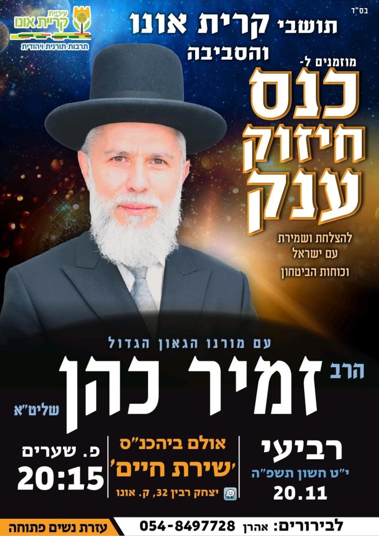 כנס חיזוק ענק עם הרב זמיר כהן: תושבי קריית אונו והסביבה, מחכים לכם ביום רביעי הקרוב (20.11) בשעה 20:15. כל הפרטים