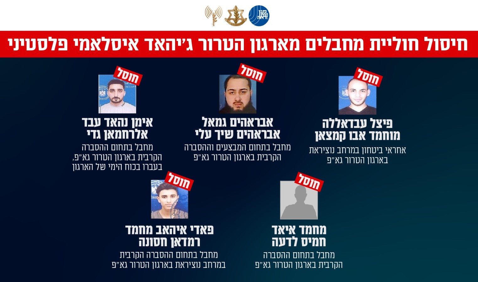 דובר צה"ל הודיע היום (חמישי) אחר הצהריים על חיסולם בעזה של חמישה מחבלים המשתייכים לג'יהאד האיסאלמי, שהסוו את פעולות הטרור שלהם תחת כיסוי עיתונאי.