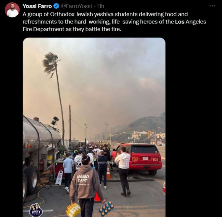 "קבוצה של בני ישיבה אורתודוקסית מעבירים אוכל ושתייה לכוחות ההצלה וכיבוי האש, שעמלים קשה לכיבוי השריפות בעיר.