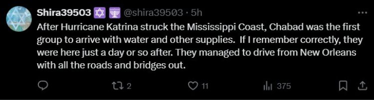 בהוריקן 'קתרינה' חב"ד היו הראשונים להיות במקום ולעזור עם אספקה של אוכל ומים".