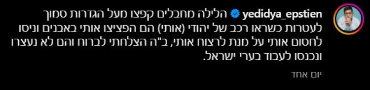 העיתונאי ידידיה אפשטיין הותקף ליד מושב עטרות על ידי שב"חים: "הם ניסו לחסום אותי על מנת לרצוח אותי"