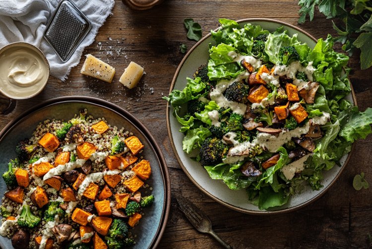 סלט חם עם קינואה: ערבבו קינואה מבושלת עם ירקות קלויים (כמו בטטה, ברוקולי ופטריות) ורוטב טחינה.