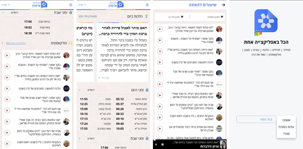 הדבר הבא שגיליתי הוא הפודקאסטים שהאפליקציה מציעה. נדהמתי לגלות כי פרקים מתכניות אהובות באתר מופיעים בגרסת פודאקסט באפליקציה. מצאתי שם פרקים מתוך התכניות "פתוח" של אפרת ברזל, שיעורי תורה של הרב זמיר כהן, שירים של זמרים אהובים ועוד תוכן רב, שהפך את האפליקציה להרבה יותר מסידור דיגיטלי רגיל.