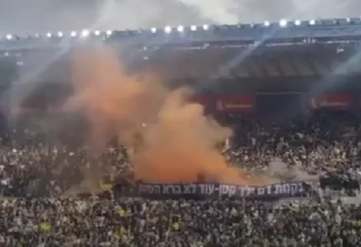 אוהדי בית״ר והפועל ירושלים צועקים את שמותיהם של בני משפחת ביבס, עם עשן כתום - לזכרם
