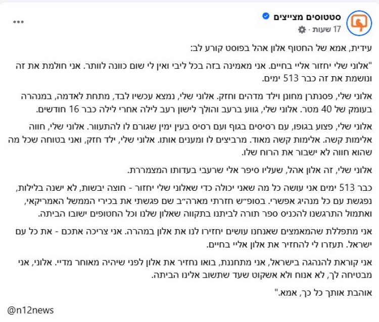 אמו של החטוף אלון אהל בפוסט קורע לב: "מאמינה שהוא יחזור אליי בחיים"