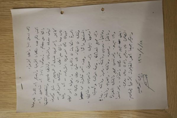 במכתב כתב: "לרעייתי נדיה ולמשפחתי היקרים, אני כותב לכם את מילותיי האחרונות ומבקש מכם לשמור תמיד על קשר ביניכם. ממך נדיה אני מבקש שתסלחי לי ושתדאגי לעצמך ולילדים. תדאגי להם לחינוך. אל תמנעי מעצמך או מהם דבר, ושמרי על קשר עם משפחתי. את יכולה להינשא למישהו אחר כדי שהילדים לא יגדלו בלי אבא. יש לך את החירות המלאה לכך, ובבקשה, אל תבזבזי את זמנך בבכי על מה שהיה אלא תחשבי תמיד על העתיד. אל תשכחי להתפלל לעילוי נשמת אבי ונשמתי".