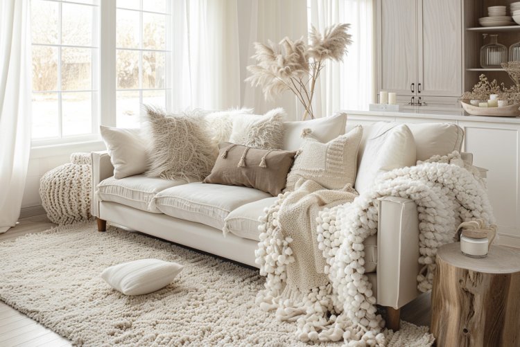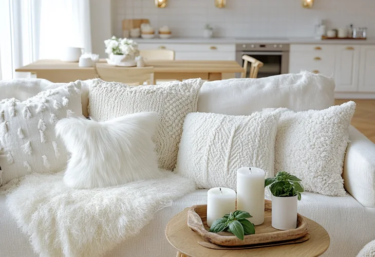 שלבו טקסטורות רבות של חומרים ומרקמים שונים, ושחקו עם חומרים לבנים בעלי ברק ברמות שונות שיעשירו את החלל. הניחו שטיח צמר גס לצד וילונות אורגנזה שקופים וקלילים, שלבו ארונות מטבח בצבע לבן מט לצד שיש מבריק, הוסיפו לספה הלבנה כריות נוי במגוון בדים מסוגים שונים, כמו כותנה, קטיפה, פרווה או צמר.