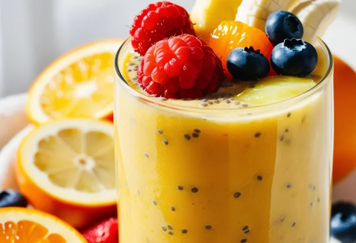 שייק הדרים מרענן: תפוזים, אננס ובננה עם זרעי צ'יה וקצת פירות יער מעל.