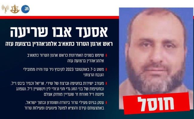 צה"ל חיסל בעיר עזה את אסעד אבו שריעה, מפקד ארגון "גדודי אל-מוג'אהידין" שפיקד על הטבח בניר עוז. הוא אחראי לחטיפתם ורציחתם בשבי של שירי ביבס וילדיה, של גדי חגי וג'ודי ויינשטיין-חגי ושל האזרח התאילנדי נטפונג פינטה