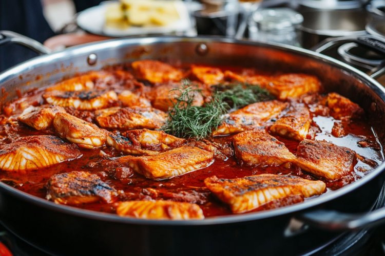 במחבת עמוקה או סיר רחב שמים את השמן והשום הכתוש. מטגנים דקה עד להזהבה ומוסיפים את העגבנייה המגוררת. מטגנים על אש גבוהה 3-4 דקות ומערבבים. מוסיפים את רסק העגבניות, הפפריקה, השום, הפלפל החריף, הצ'ומה ורצועות הפלפל, ומוסיפים כוס מים. מביאים לרתיחה, בוחשים היטב ומבשלים מכוסה על אש קטנה כחמש דקות. מדי פעם מערבבים, ואם המים מתאדים לגמרי אפשר להוסיף עוד קצת. שוטפים את הדג, וחותכים לחתיכות. שמים בסיר את הדג, הכוסברה, המלח והפלפל ומוסיפים עוד כוס וחצי מים. מנערים מעט את המחבת שהרוטב יתערבב עם המים; הנוזלים צריכים לכסות בעדינות את הדג, במידת הצורך מוסיפים עוד מים. מביאים לרתיחה, טועמים ומתקנים תיבול ומבשלים מכוסה על אש נמוכה 20 דקות. לפני שבת מחממים ומניחים על הפלטה.