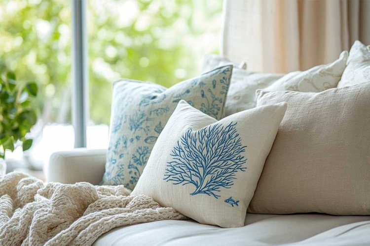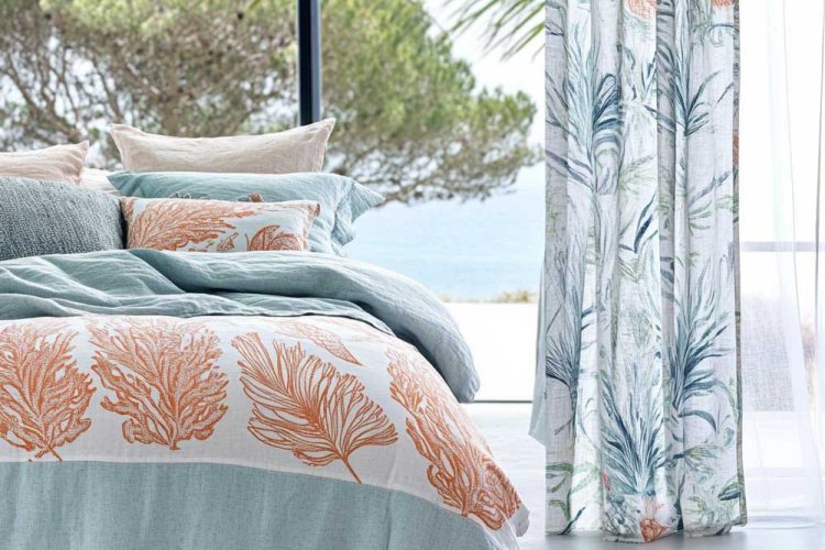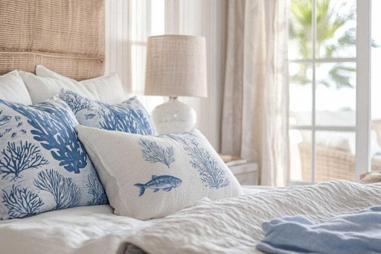 כריות מבד פשתן או כותנה טבעית בגוונים חוליים, שמיכות קלילות בצבעים רגועים, וילונות שמתנפנפים ברוח עם שקיפות עדינה, כל אלה יוצרים תחושה של בית נופש על שפת הים.