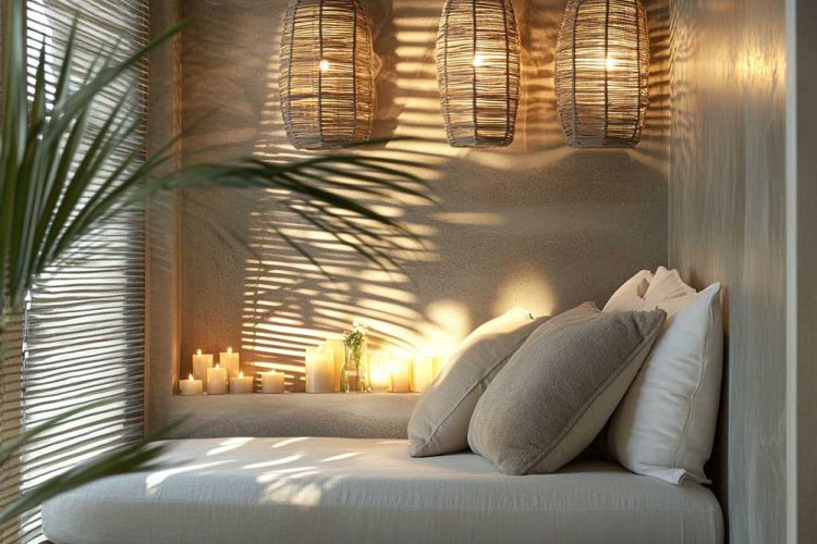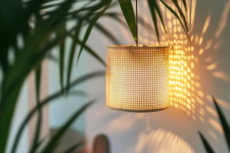 בחרו בתאורה רכה בגוון חם, עם גוף תאורה מחורר או קלוע שזורק צללים כמו אור שמש דרך ענפי דקל.