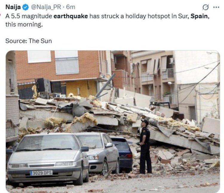 רעידת אדמה בעוצמה 5.5 פגעה הבוקר (ב') בחלקים מספרד, כולל קוסטה דל סול ואליקנטה - אזורים פופולריים בקרב חובבי שמש, שהגיעו לנפוש בעיירות הנופש. רעידת האדמה נרשמה כאחת החזקות שידעה ספרד בשנים האחרונות, והיא תועדה בכ-50 עיירות וערים ברחבי המדינה.