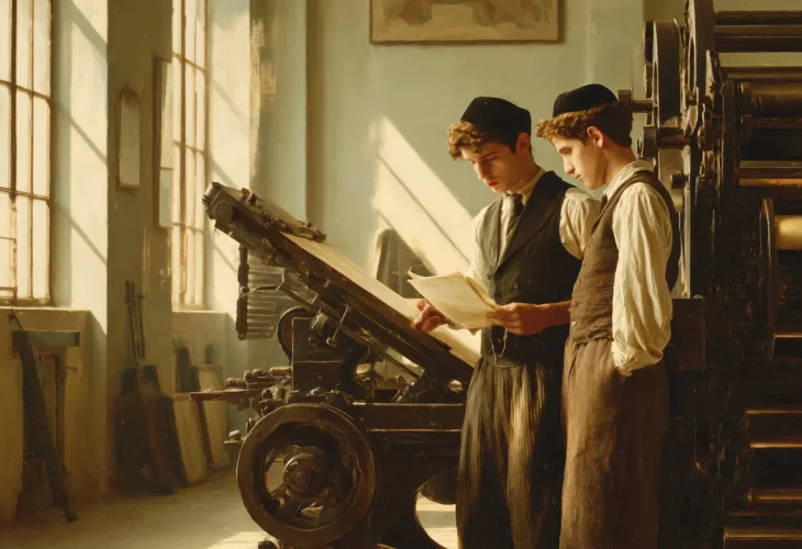 תחת רשרוש קבוע ומתכתי של גלגלי שיניים, עמדו שני אחים צעירים זה לצד זה, רכונים ומרוכזים אל לב לבה של המלאכה – מכונת דפוס כבדה, עשויה ברזל וידיות עץ, שחלקיה התנשפו כחיה מגששת. הייתה זו מכונה מודרנית יחסית לזמנה, אחת ממכונות הדפוס המשוכללות בברסלאו של ראשית המאה התשע-עשרה, בבית הדפוס שבבעלות אביהם – ר' יחיאל מיכל מייא, מוכר ספרים ונדבן מקומי נודע.