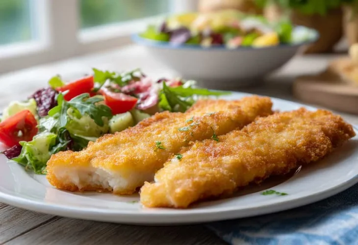 - מניחים על נייר סופג ומגישים חם עם פלחי לימון, צ’יפס, פירה וסלט ירקות קצוץ.