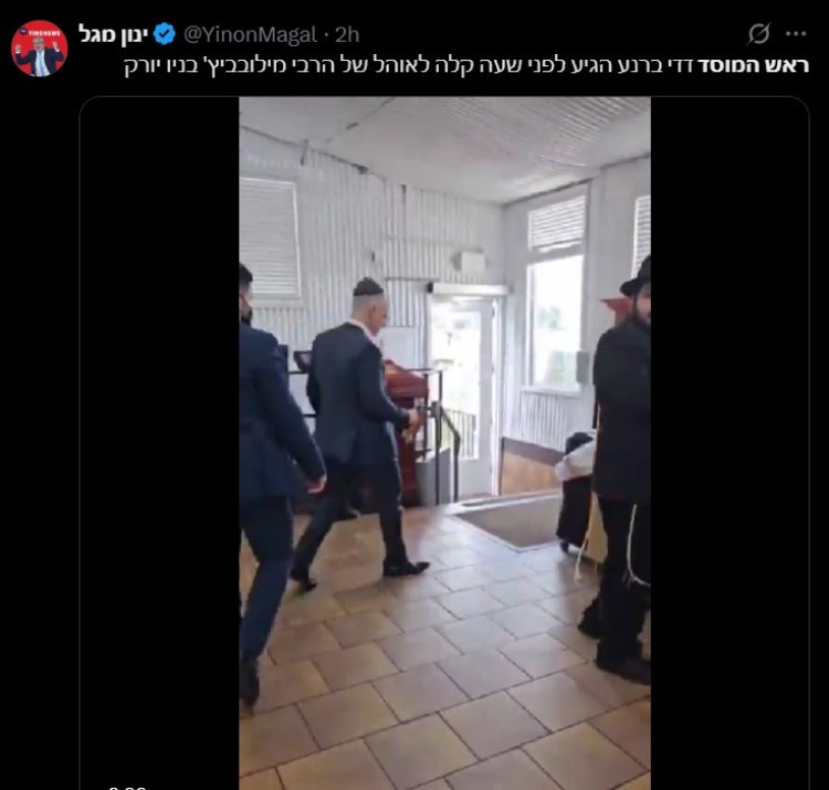 צילום: חיים גולדברג / פלאש 90ראש המוסד דוד 'דדי' ברנע הגיע לביקור רשמי בניו יורק, והתפלל בקברו של הרבי מליובאוויטש כשעל ראשו כיפה שחורה גדולה. על פי הדיווחים, הביקור בקבר הרבי מתקיים במסגרת סבב שיחות מדיניות חשוב שהתקיים בוושינגטון. בתיעוד שהפך לויראלי ברשתות החברתיות נראה ברנע כשהוא מלווה במספר מאבטחים שפניהם כוסו במסכה, ואת הפמלייה ליוו גם כמה רבנים ושלוחי חב"ד.