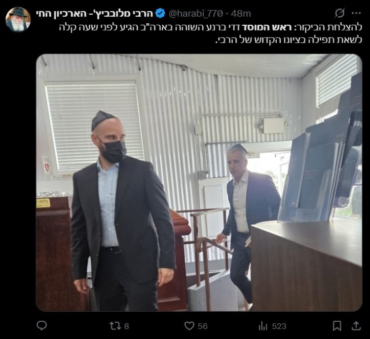 ראש המוסד דוד 'דדי' ברנע תועד כשהוא מבקר בקבר הרבי מליובאוויטש בקווינס, כשעל ראשו כיפה שחורה גדולה ובידו סידור תפילה