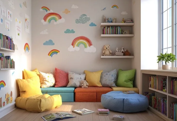 יש מדבקות קיר צבעוניות בכל נושא: חלל, חדי קרן, ספורט, בעלי חיים. כשהילדים בוחרים, הם מרגישים שהחדר באמת שלהם.פינת קריאה עם כריות