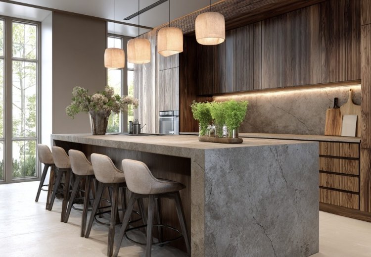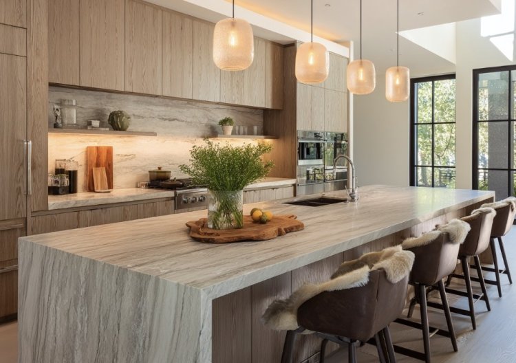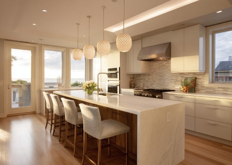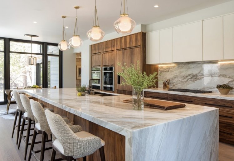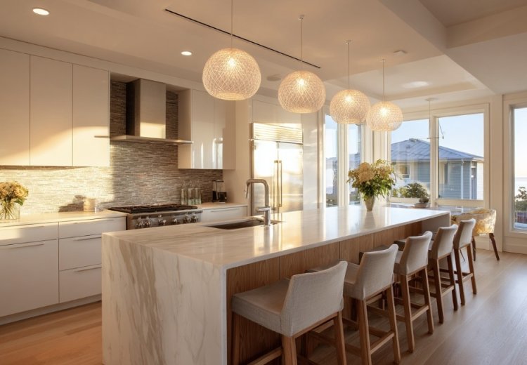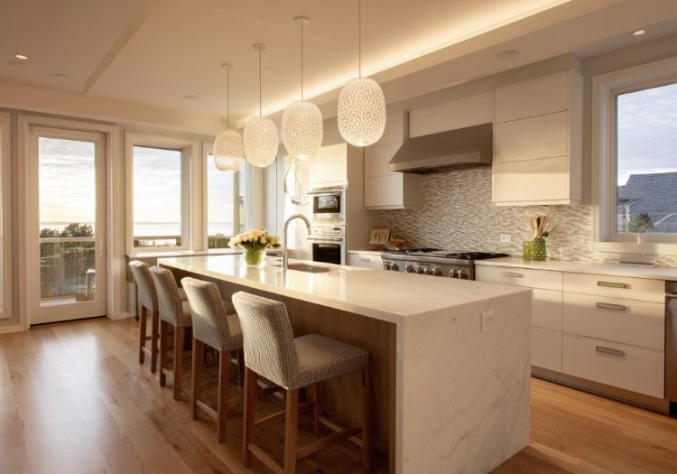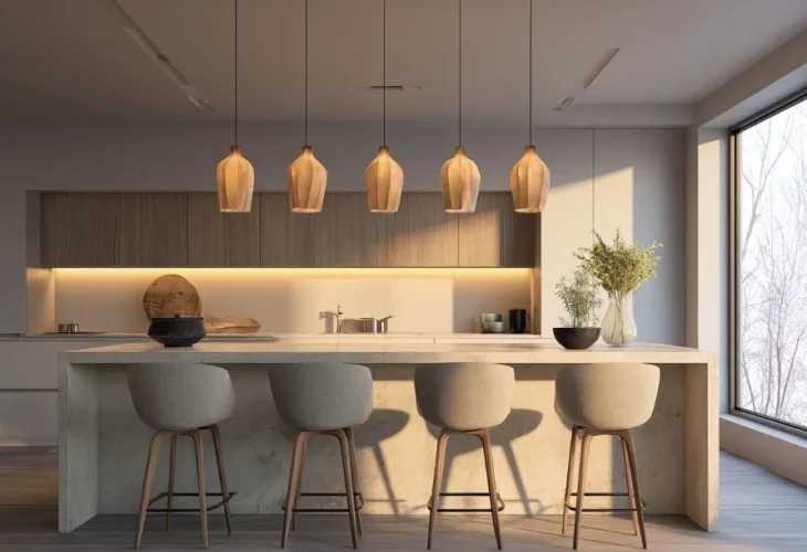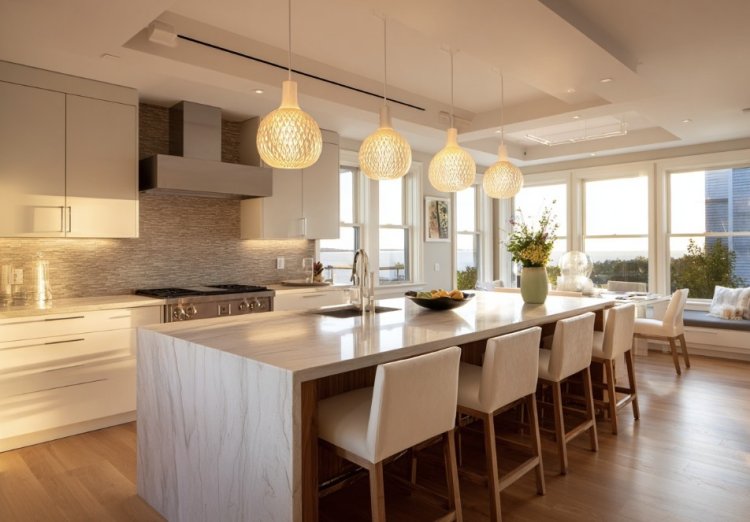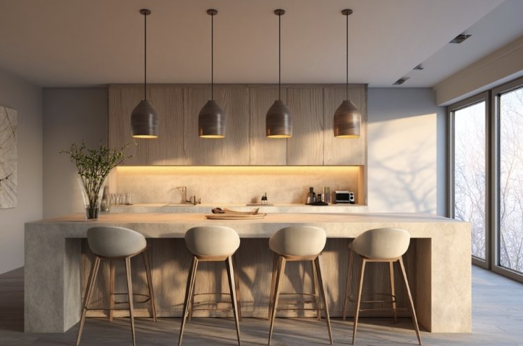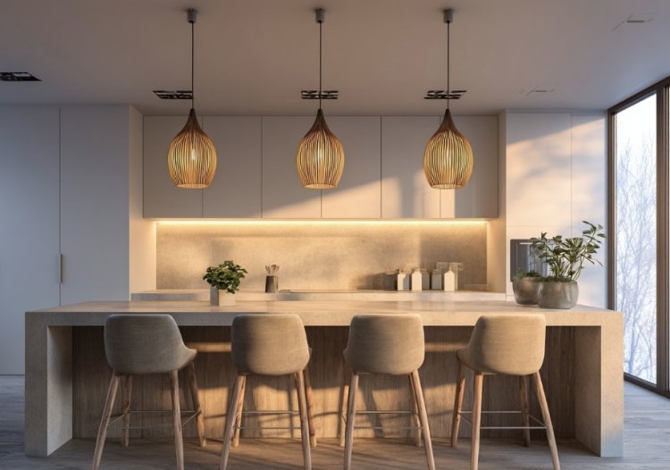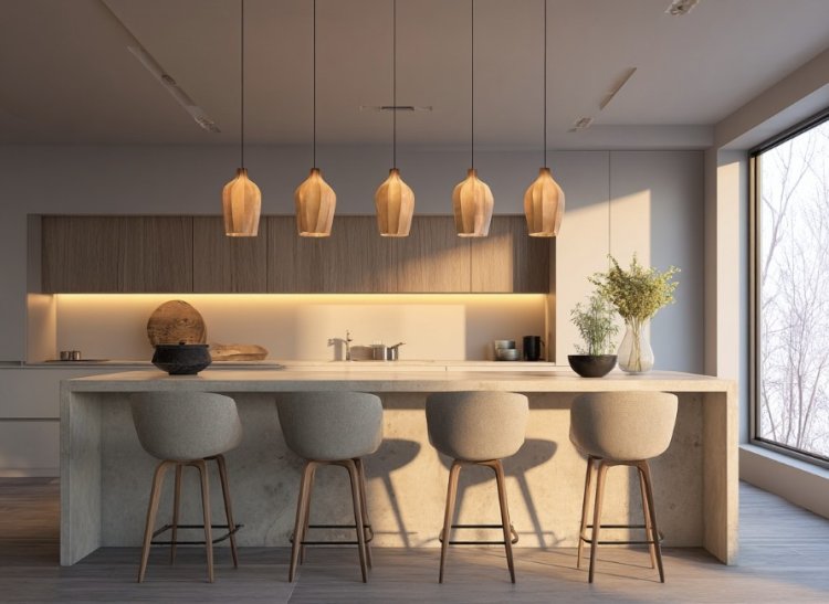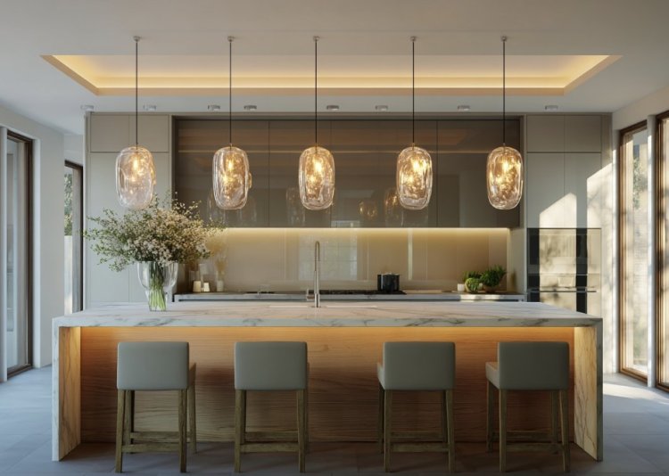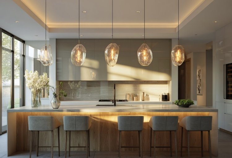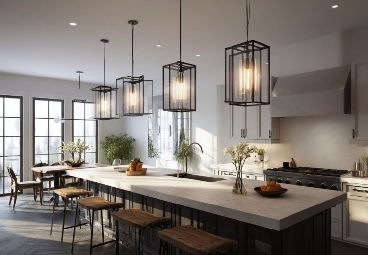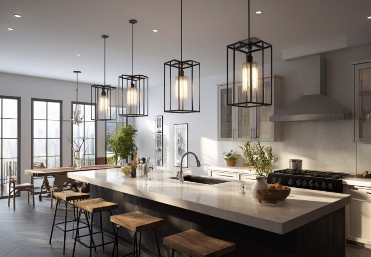 גופי תאורה תלויים מעל האי לא רק מדגישים את מרכז המטבח, אלא גם מספקים תאורה פונקציונלית לבישול ולעבודה. מומלץ לשלב בין תאורה רכה לאווירה לתאורה חזקה לנוחות.
