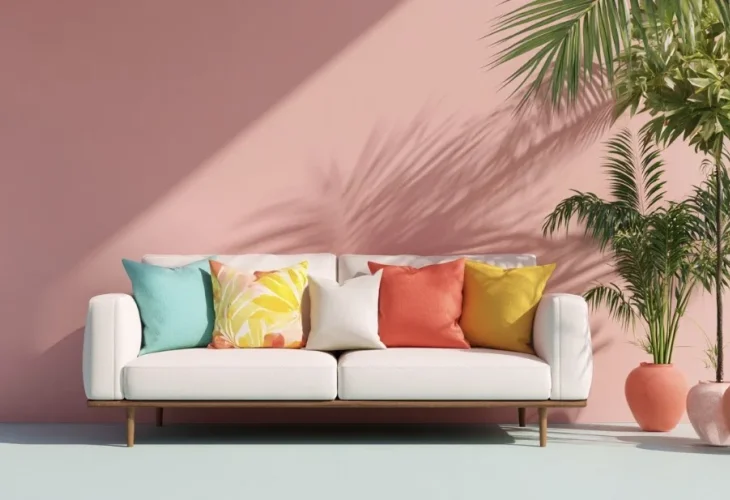 הניחו לרגע לשגרה, ושקעו באווירה קיצית מרעננת: ספה אחת, צבעים עליזים ורקע ורוד שגורם לכל חלל להרגיש כמו חופשה: 5 כללי ברזל לעיצוב נכון של הבית
