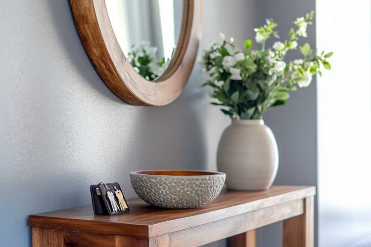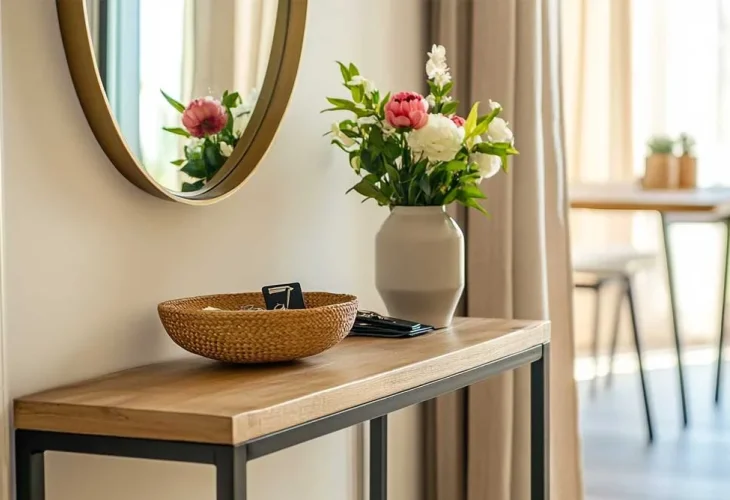 קונסולה עם מראה יפה, קערה למפתחות ואגרטל פרחים. להיכנס לבית בסטייל.