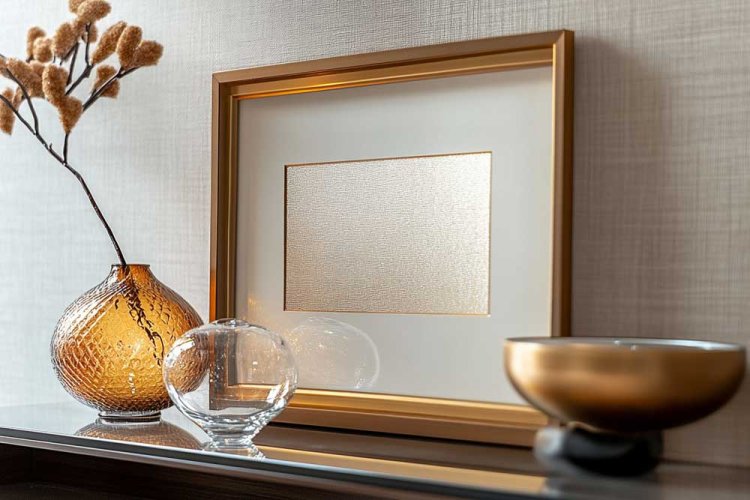 מדף ועליו מסגרת מוזהבת, כלי זכוכית ואקססוריז בגווני נחושת - יוסיפו קצת "גלאם" גם לפינה הכי משעממת.