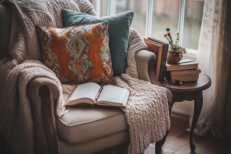 כורסה עם כרית צבעונית, שולחן צד קטן, יומן לחלומות שלך ועט יפה. מקום לעצור לרגע ולכתוב.