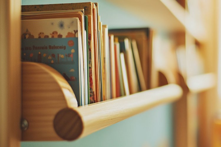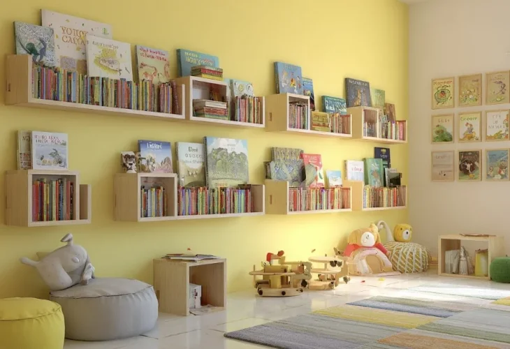מדפי עץ קטנים בגובה העיניים של הילד מעודדים אהבה לספרים, וגם משמשים אלמנט עיצובי צבעוני.