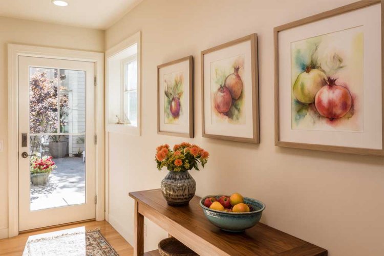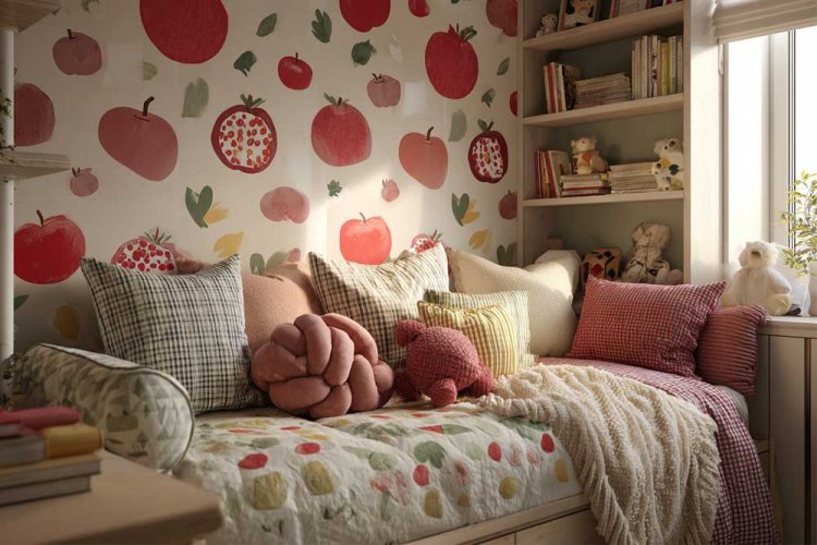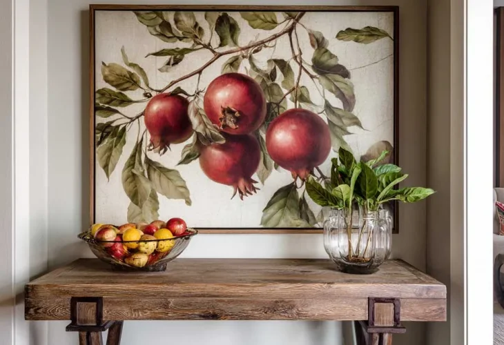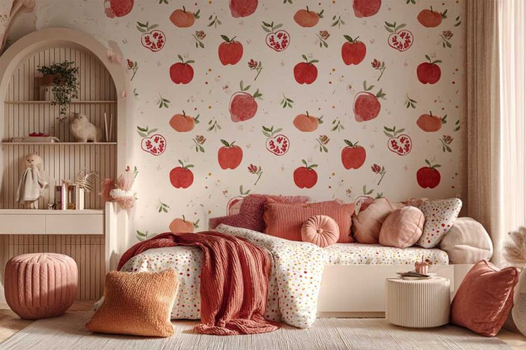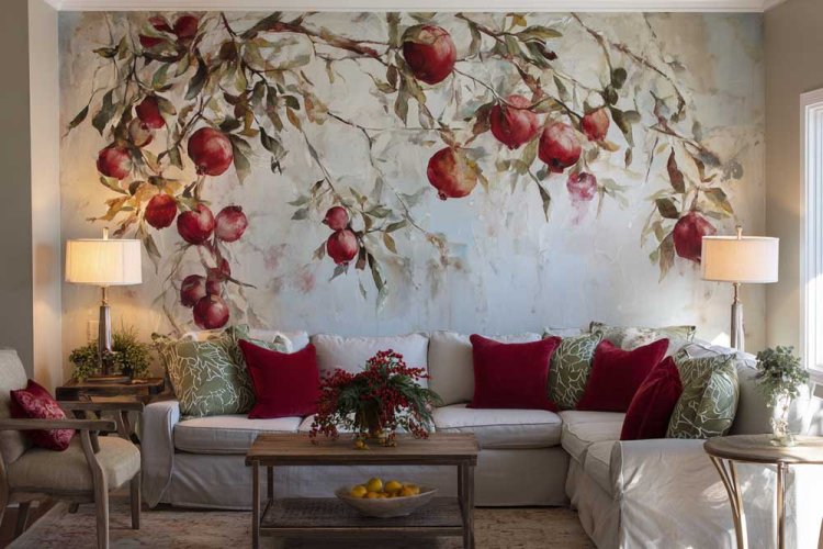 8. טפט רימונים, כריות בורדו תואמות ופרחים שמתכתבים עם העיצוב.