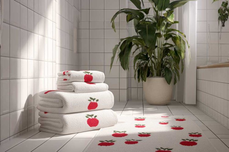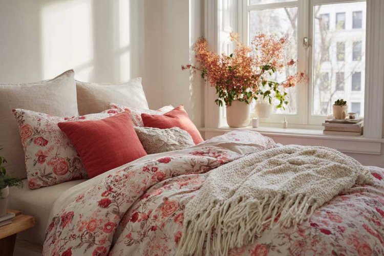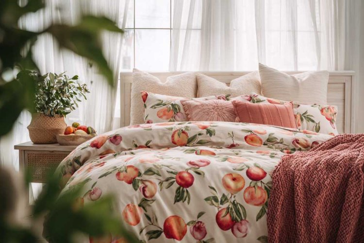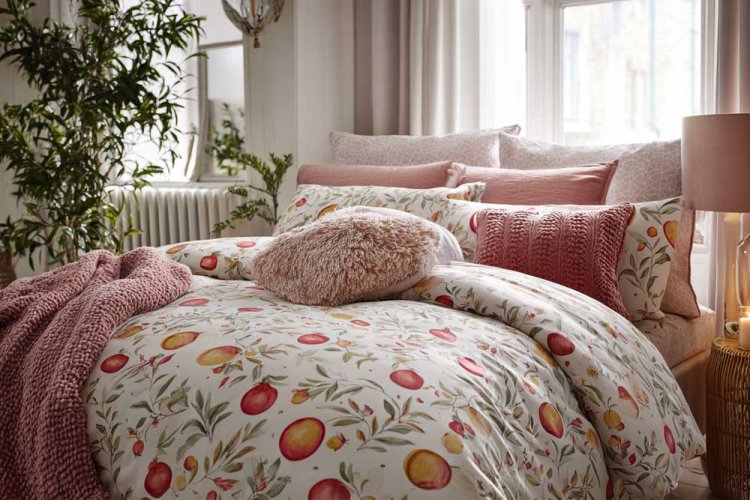3. מצעים בדוגמת רימונים או תפוחים - את הטקסטורה אפשר להוסיף בכריות סרוגות או פרוותיות.