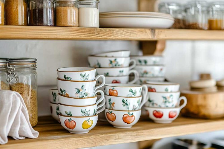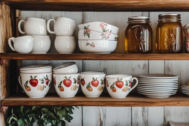5. ווינטאג' קסום. כוסות, מאגים, קערות באיור ידני של תפוחים.