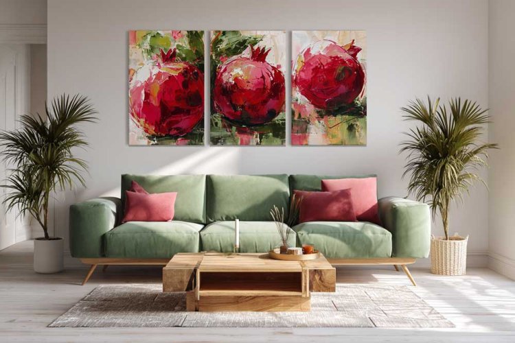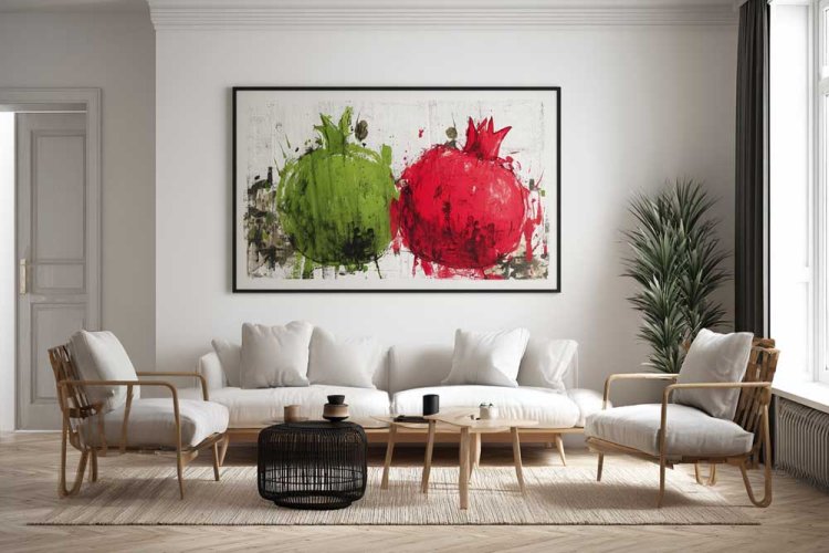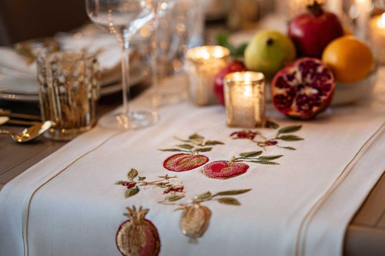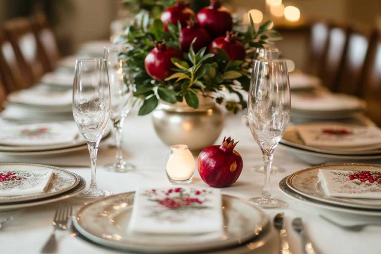 1. נתחיל מהבייסיק: רימונים על השולחן, מפיות בדוגמא דומה.