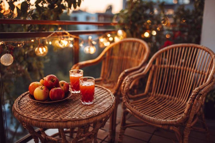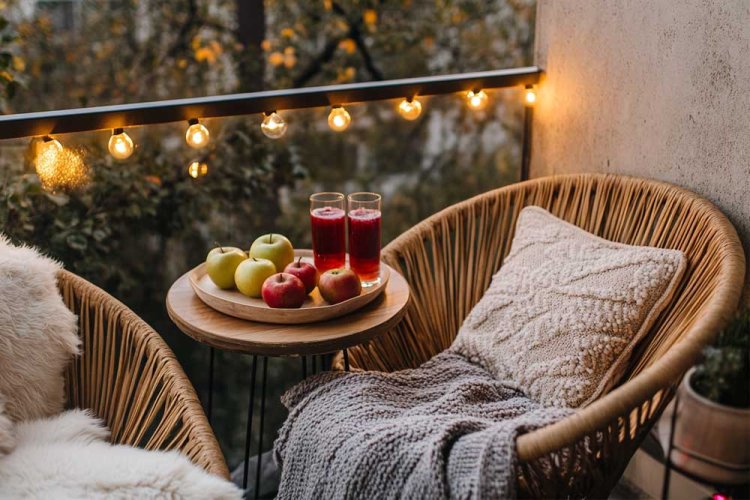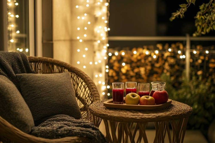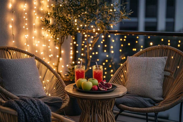 11. מרפסת סתווית. השילוב של רימונים, תפוחים ותאורה חמה - נעים לעין.
