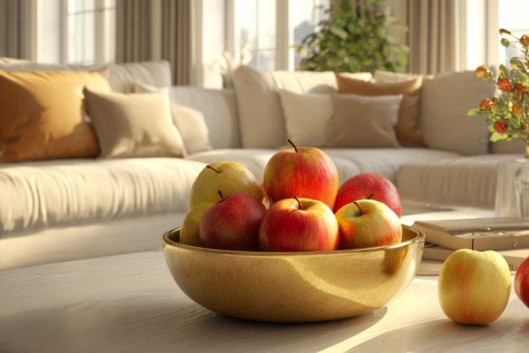 2. קערה מוזהבת מלאה בתפוחים. קלאסי ונקי.
