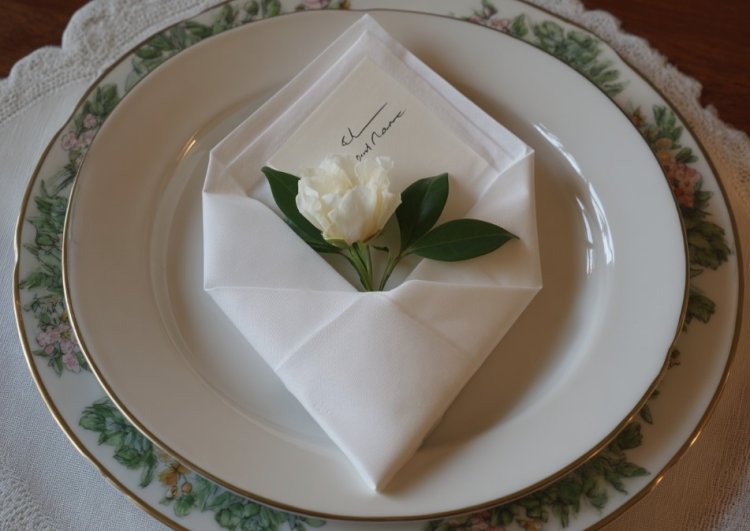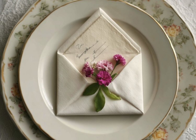 מקפלים את המפית לצורת מעטפה ומכניסים לתוכה ברכה קטנה, פסוק השראה או אפילו תפריט אישי לכל סועד. זה מוסיף מגע אישי וחמים שמרגש את האורחים.