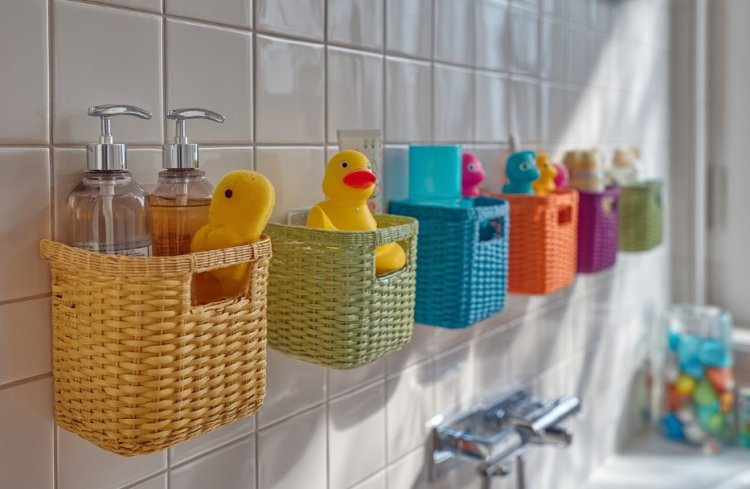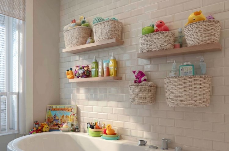 פתרון דקורטיבי ושימושי לאחסון שמפו, סבונים או צעצועי אמבטיה של הילדים.