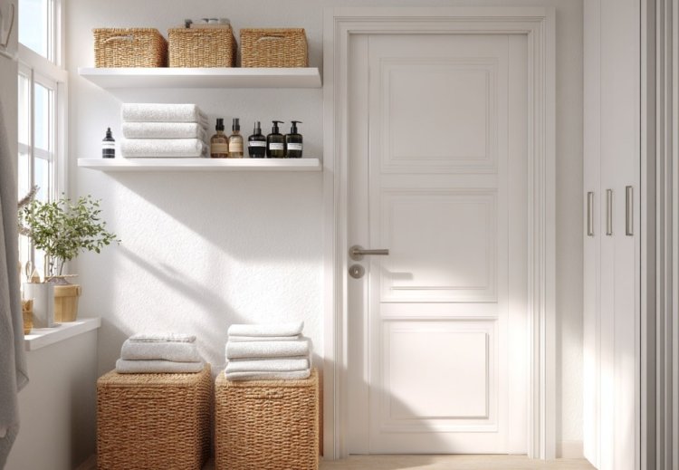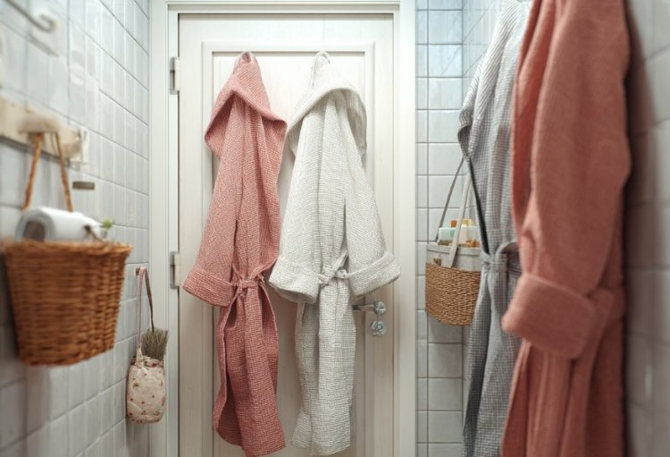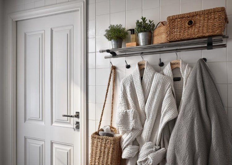 מתלים פשוטים שמתחברים לחלק הפנימי של הדלת יכולים לשמש למגבות, חלוקים או אפילו סלסילות עם מוצרי טיפוח.