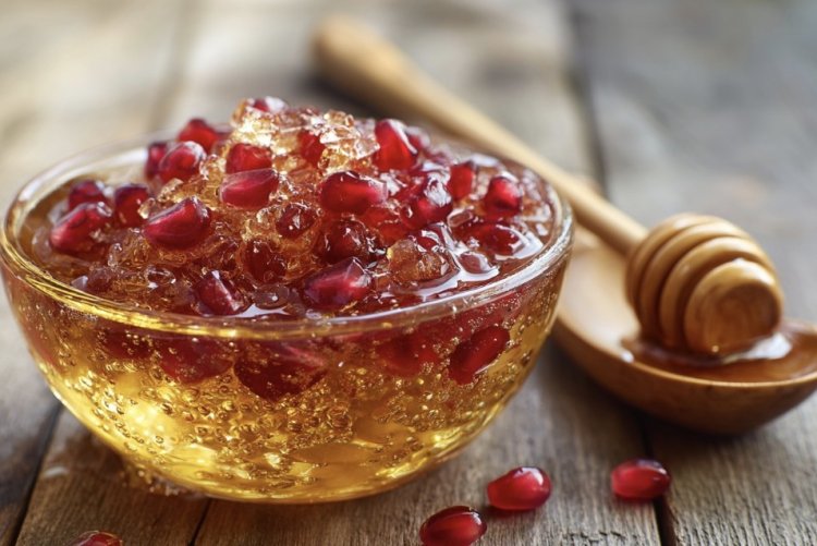 ערבוב גרגרי רימון כתושים עם כפית דבש, להזנה ורכות לעור יבש.