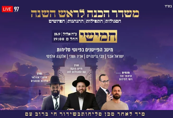 חמישי החל מהשעה 19:00: משדר הכנה מרגש לראש השנה, בהשתתפות פייטנים ורבנים. שידור חי באתר ובערוץ הידברות