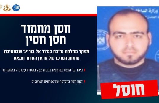 המחבל חסן מחמוד חסן חסין, ששימש כמפקד מחלקת נוח'בה בגדוד אל בורייג' של חמאס, חוסל על ידי צה"ל והשב"כ. פיקד בזמן הטבח בעוטף, יחד עם המחבל מוחמד אבו עטיוי שחוסל באוקטובר 2024, על המחבלים שרצחו וחטפו ישראליים מהמיגונית ליד רעים