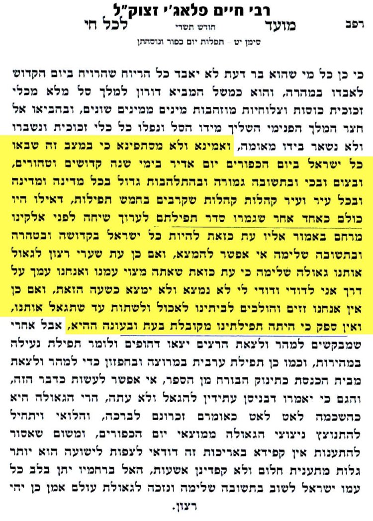 לדבריו, אילו היינו ממשיכים את ההתלהבות והקדושה עוד מעט, וזועקים לבורא עולם שאיננו חוזרים לבתינו עד שיגאל אותנו גאולת עולם, תפילתנו הייתה מתקבלת בשמים לגאולה שלמה. כה דבריו: "במצב זה שבאו כל ישראל ביום הכיפורים, יום אדיר בשנה, קדושים וטהורים, ובצום ובכי ותשובה גמורה, ובהתלהבות גדול בכל מדינה ומדינה ובכל עיר ועיר קהילות קהילות שקרבים ב-5 תפילות - דאילו היו כולם כאחד אחר שגמרו סדר תפילתם לערוך שיחה לפני אלוקינו מרחם באמור אליו: 'עת כזאת, להיות כל ישראל בקדושה ובטהרה ובתשובה שלמה אי אפשר להימצא, ואם כן עת שערי רצון לגאול אותנו גאולה שלמה כי עת כזאת שאתה מצוי עמנו, ואנחנו עמך, על דרך 'אני לדודי ודודי לי' לא נמצא ולא יימצא כשעה הזאת, ואם כן אין אנחנו זזים והולכים לבתינו לאכול ולשתות עד שתגאל אותנו' – ואין ספק כי היתה תפילתנו מקובלת בעת ובעונה ההיא".
